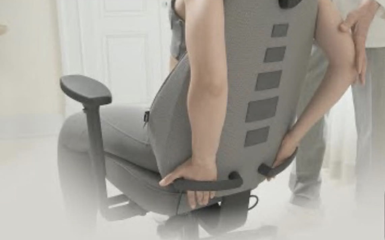 Ypatingas šios terapinės kėdės elementas – atloše integruotos rankenos, už kurių delnais į vidų užkišus rankas skatinamas pečių atvedimas. Daugeliui žmonių – tai ypač svarbi laikysenos korekcija. Krūtininės stuburo dalis – dažnai pamirštama jungtis tarp kaklo ir apatinės nugaros – atlieka esminį vaidmenį laikysenai, kvėpavimo mechanikai ir pečių judrumui. Šiuolaikinis statiškas sėdėjimas šią sritį „užrakina“, tuo pačiu mažindamas plaučių ventiliaciją, kraujotaką ir giliųjų nugaros raumenų aktyvumą.